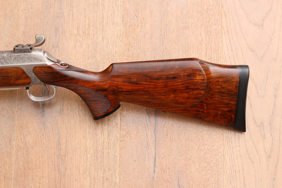 Die Büchse hat ein nitriertes System, auf dem zwei sehr detailreiche Büffel graviert sind. Der enganliegende Kammergriff ist graviert und mit Gold eingelegt. Auf dem System sind schon die Aufnahmen für eine EAW Schwenkmontage montiert die ebenfalls mit nitriert und graviert sind. Alle Gravuren wurden sorgfältig von Hand gefertigt.